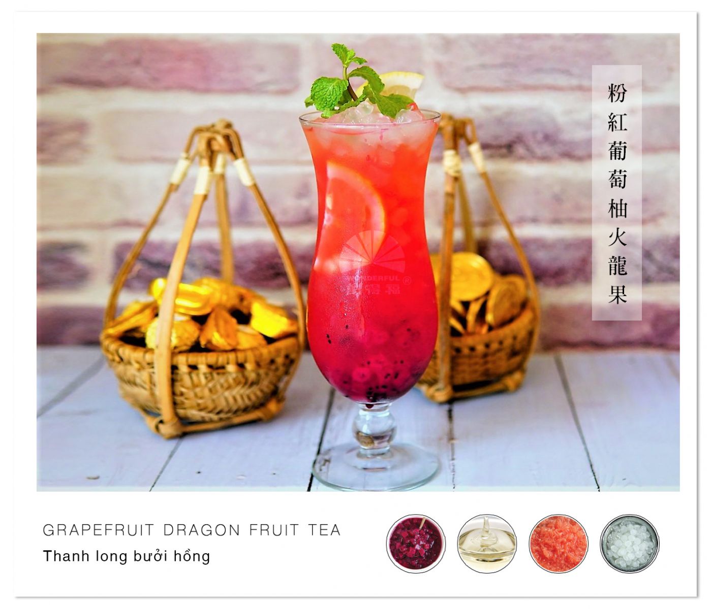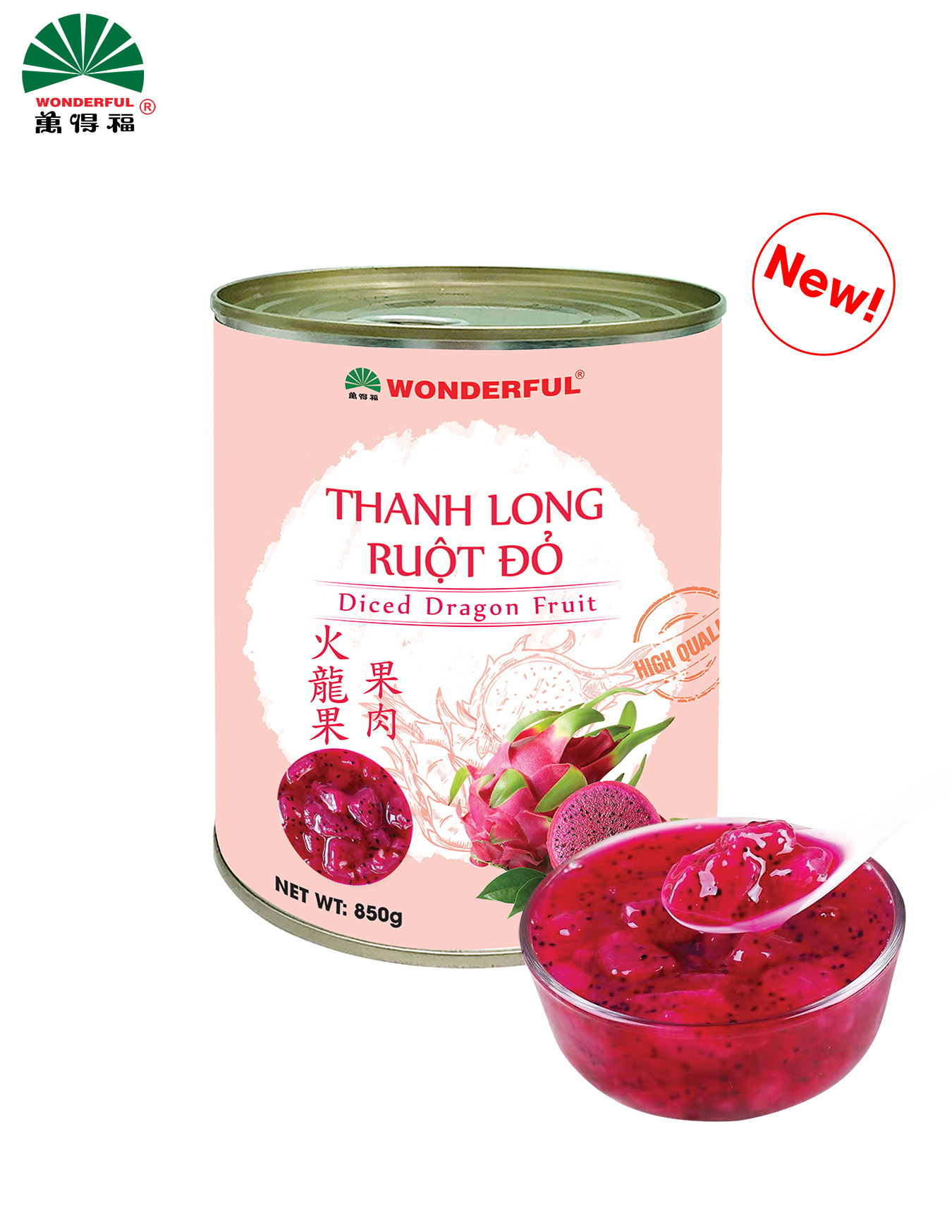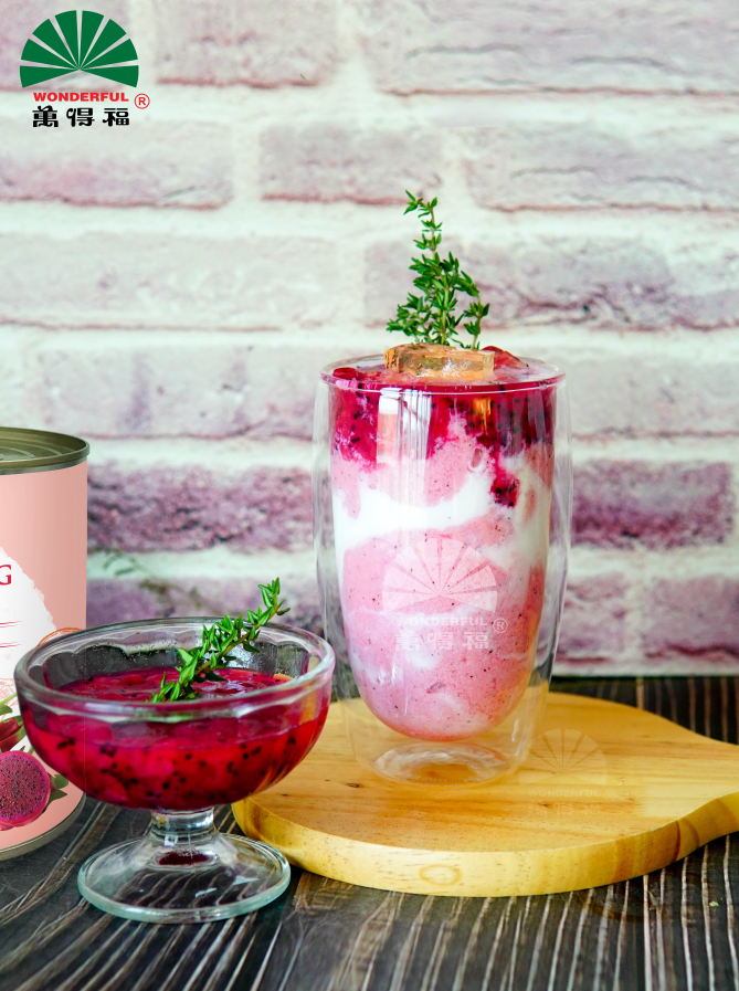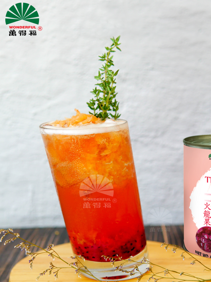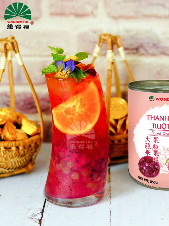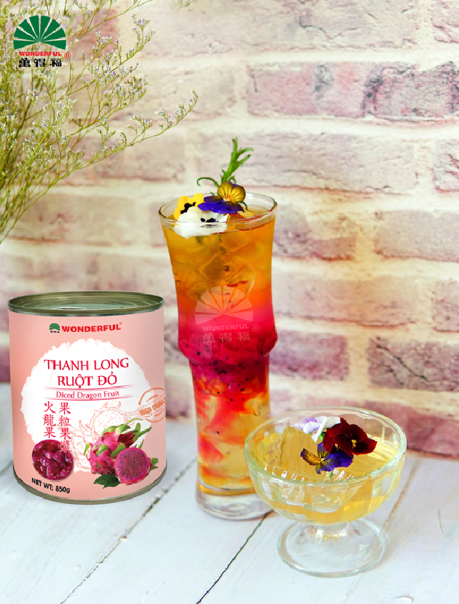 Thanh long ruột đỏ Wonderful: Với hơn 90% thành phần là thanh long tươi, sản phẩm Thanh Long Ruột Đỏ mang đến cảm nhận tự nhiên nhất cho người thưởng thức và hương vị thơm ngon cho đồ uống. Sản phẩm được đóng lon nhỏ rất thuận tiện và phù hợp cho các quán trà sữa và quán cafe sử dụng. Hạn sử dụng 2 năm sẽ giúp khắc phục hạn chế về mùa vụ của nguyên liệu tươi. Sản phẩm không có chất bảo quản và chất tạo ngọt, là loại topping tươi ngon cho đồ uống của bạn. Thanh long ruột đỏ có vị ngọt thanh, đậm đặc, giàu chất xơ là sự lựa chọn thú vị cho các loại đồ uống được người Âu Mỹ ưa chuộng.